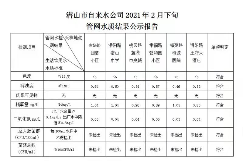 2021年2月下旬管網(wǎng)水質(zhì)結(jié)果公示報(bào)告