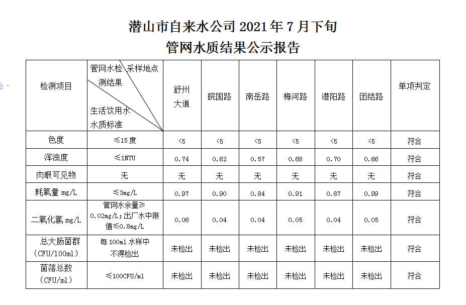 2021年7月下旬管網(wǎng)水質(zhì)結(jié)果公示報(bào)告