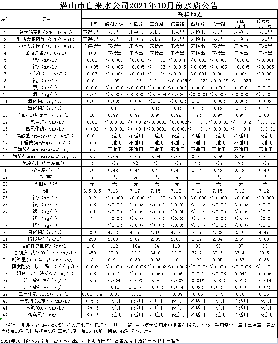 2021年10月份水質(zhì)公告