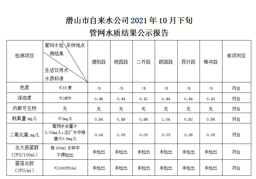 2021年10月下旬管網水質結果公示報告