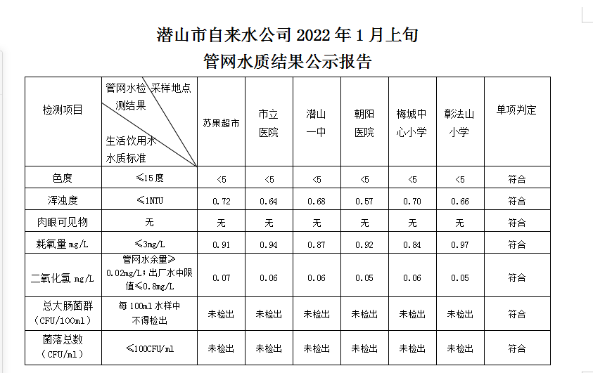 2022年1月上旬管網(wǎng)水質(zhì)結(jié)果公示報(bào)告