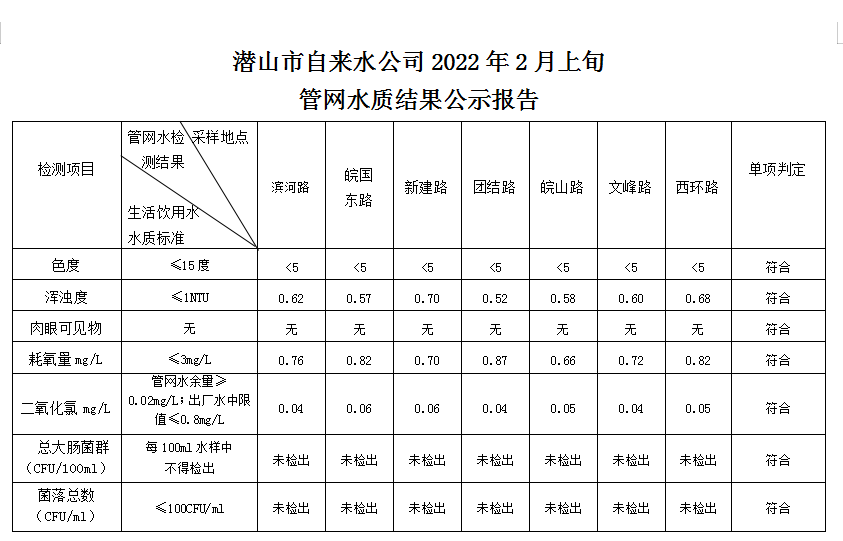 2022年2月上旬管網(wǎng)水質(zhì)結(jié)果公示報告