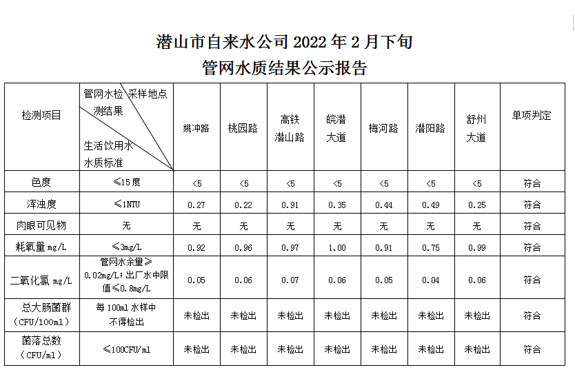 2022年2月下旬管網(wǎng)水質(zhì)結(jié)果公示報告