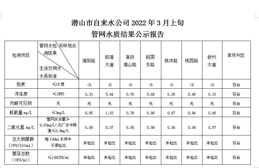 2022年3月上旬管網(wǎng)水質(zhì)結(jié)果公示報告
