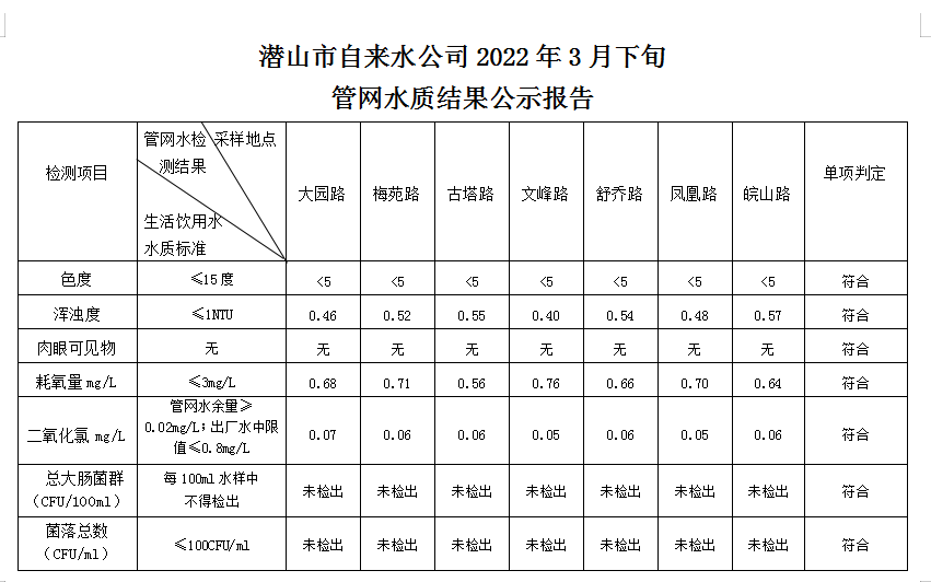 2022年3月下旬管網(wǎng)水質(zhì)結(jié)果公示報告