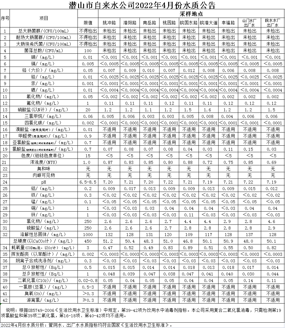 2022年4月份水質(zhì)公告
