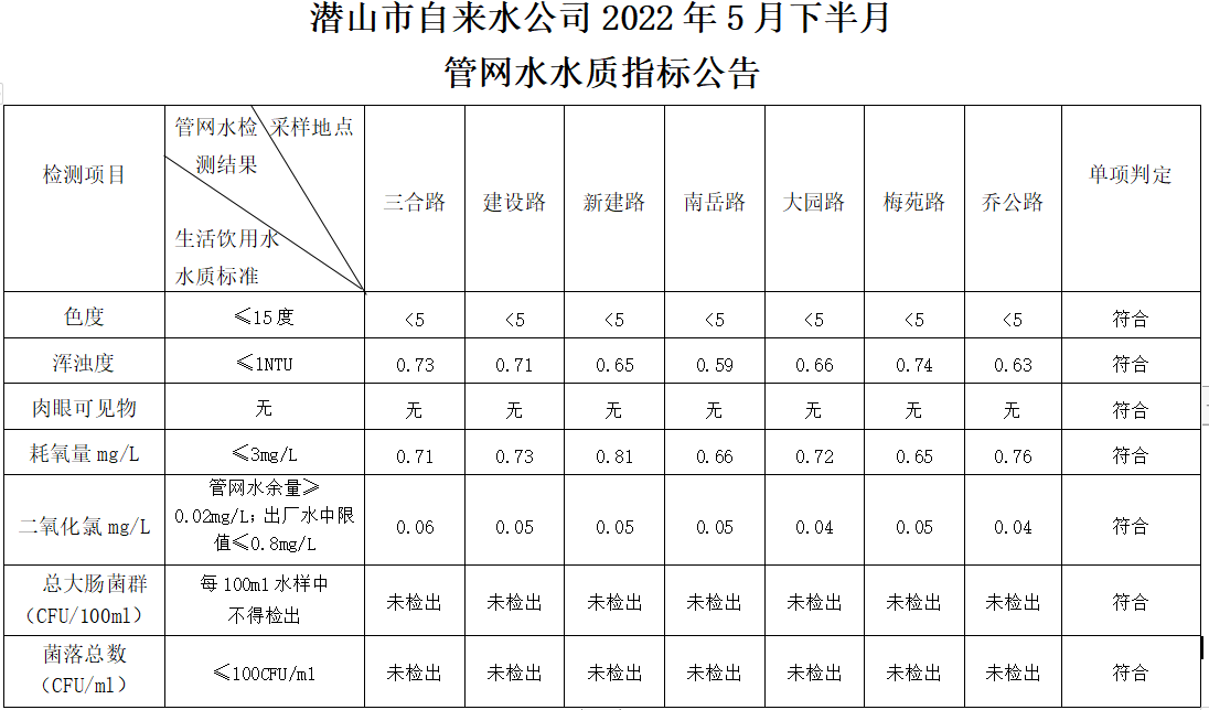 2022年5月下半月管網(wǎng)水水質(zhì)指標(biāo)公告