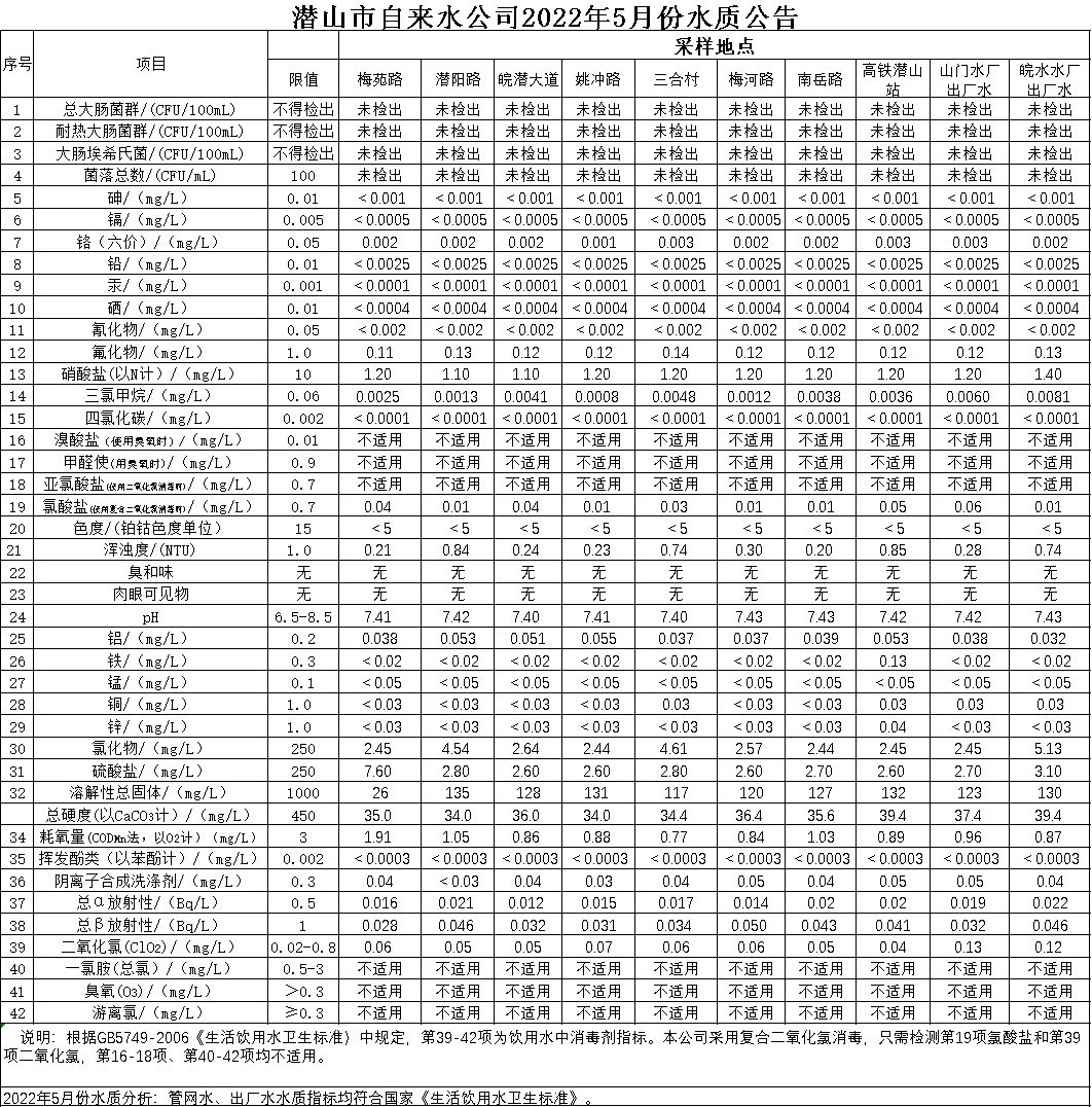 2022年5月份水質(zhì)公告