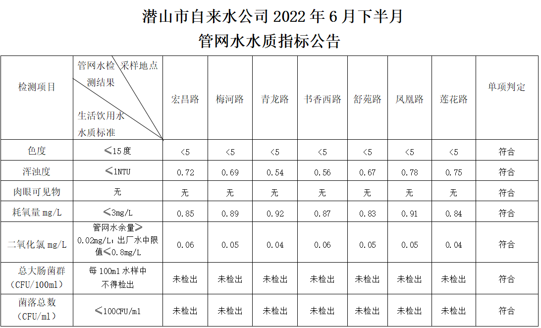 2022年6月下半月管網(wǎng)水水質(zhì)指標(biāo)公告