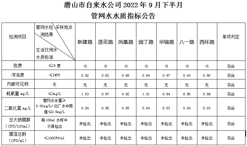 2022年9月下半月管網(wǎng)水水質(zhì)指標(biāo)公告