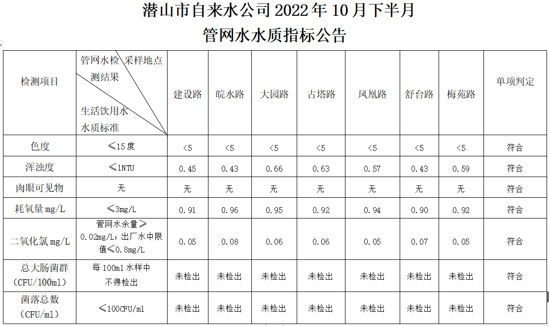2022年10月下半月管網(wǎng)水水質(zhì)指標(biāo)公告