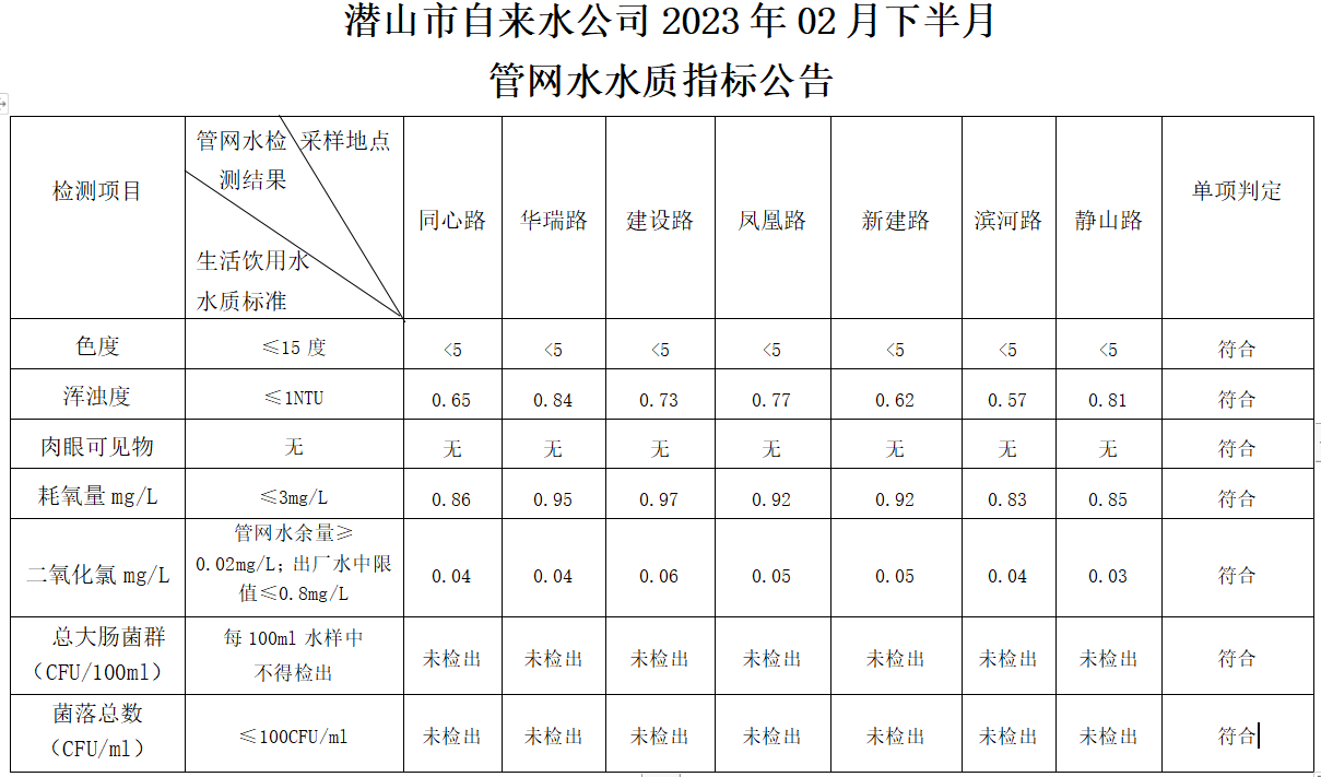 2023年02月下半月管網(wǎng)水水質(zhì)指標(biāo)公告