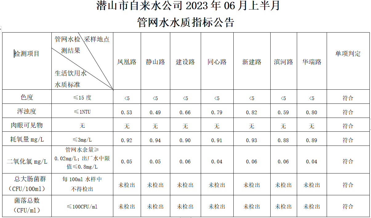 2023年06月上半月管網(wǎng)水水質(zhì)指標公告