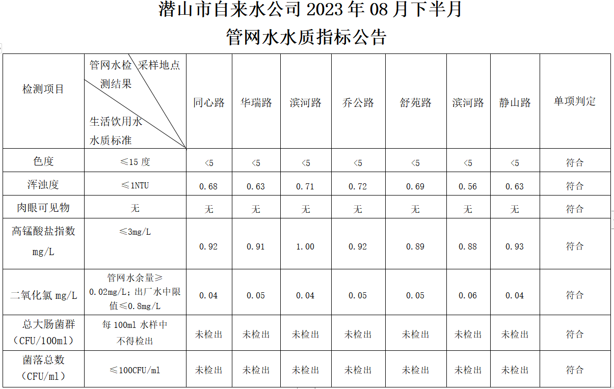 2023年8月下半月管網(wǎng)水水質(zhì)指標(biāo)公告
