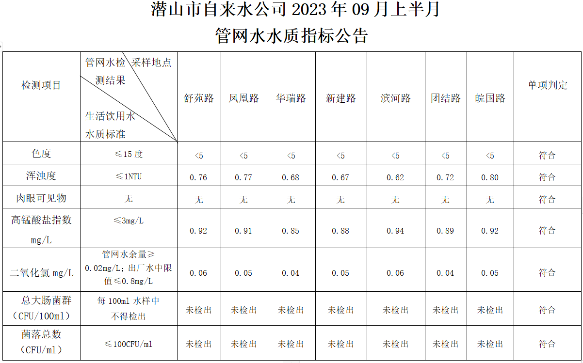 2023年09月上半月管網(wǎng)水水質(zhì)指標公告