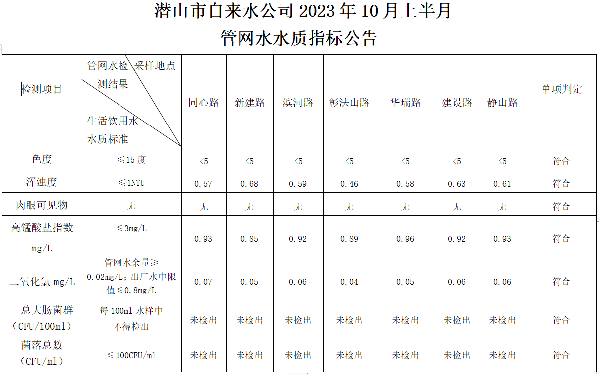 2023年10月上半月管網(wǎng)水水質(zhì)指標(biāo)公告