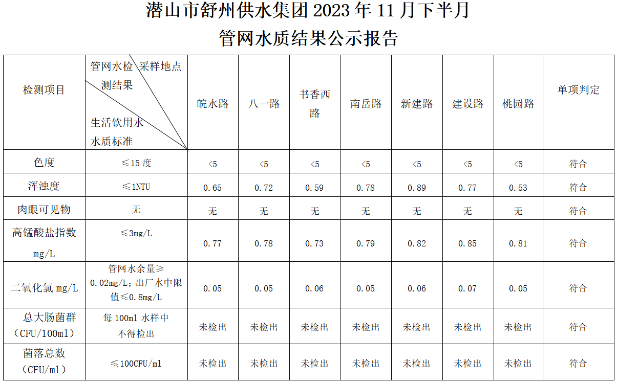 2023年11月下半月管網(wǎng)水水質(zhì)指標公告