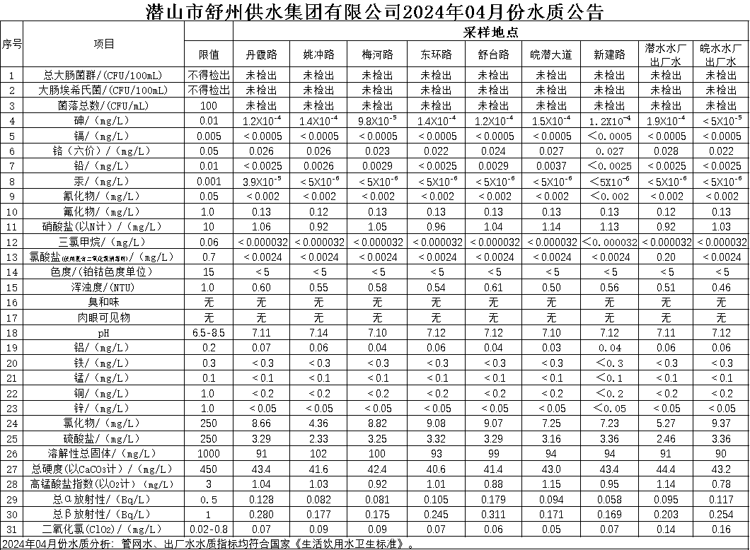 2024年04月份水質(zhì)公告
