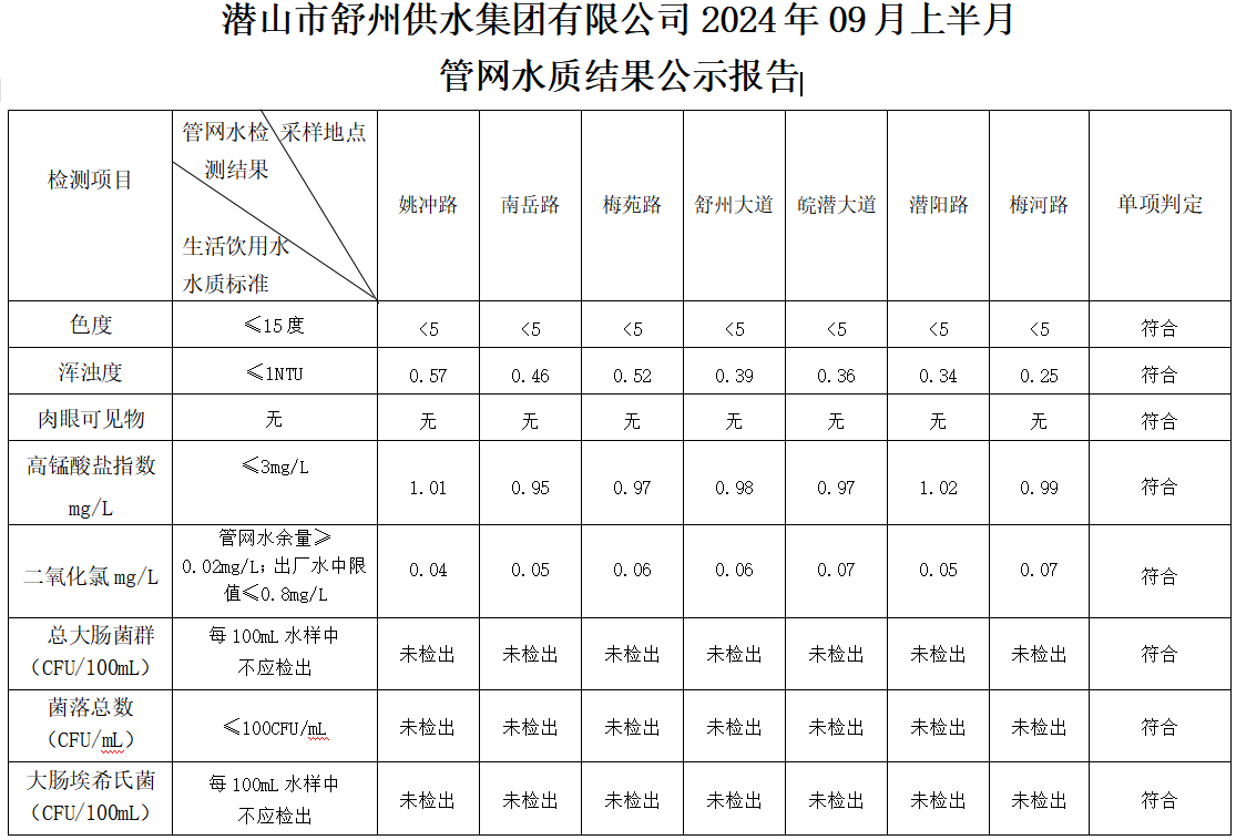 2024年09月上半月管網(wǎng)水水質(zhì)指標(biāo)公告