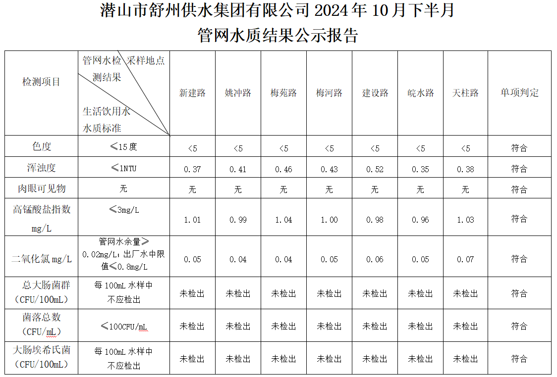 2024年10月下半月管網(wǎng)水水質(zhì)指標(biāo)公告