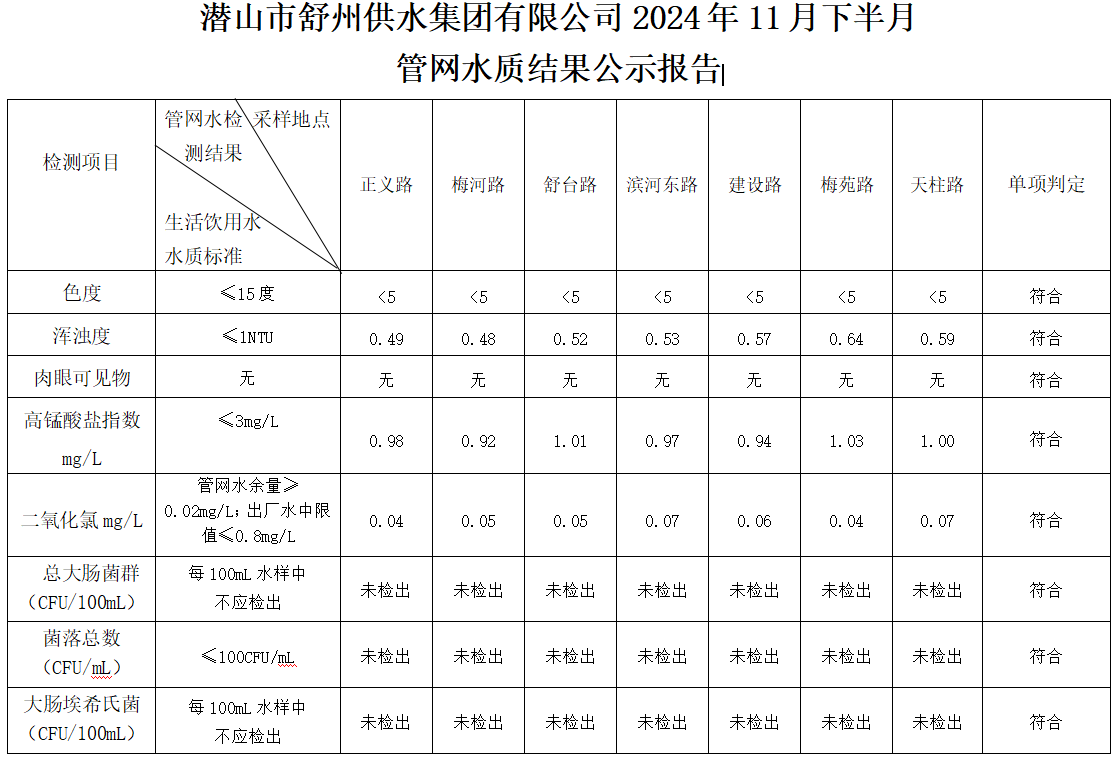 2024年11月下半月管網(wǎng)水水質(zhì)指標(biāo)公告