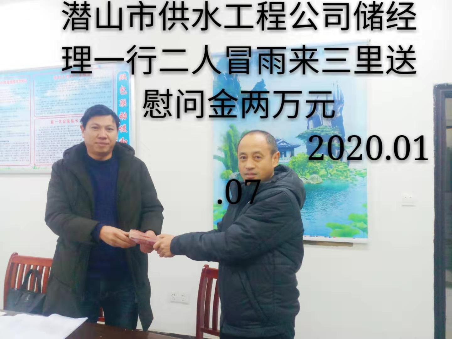 1月7日上午,供水工程公司儲(chǔ)春海副經(jīng)理一行二人冒雨前往水吼鎮(zhèn)三里村開展慰問工作,把新春問候和祝福及時(shí)送到貧困戶的心中,從精神上和物質(zhì)上給予貧困戶溫暖和關(guān)懷。供水工程公司作為三里村的定點(diǎn)幫扶企業(yè),一直關(guān)注著三里村扶貧工作的開展情況。此次慰問,詳細(xì)了解了貧困戶當(dāng)前存在的主要問題,并送上慰問金兩萬元,希望通過自己的綿薄之力,幫助他們度過一個(gè)愉快祥和的節(jié)日。