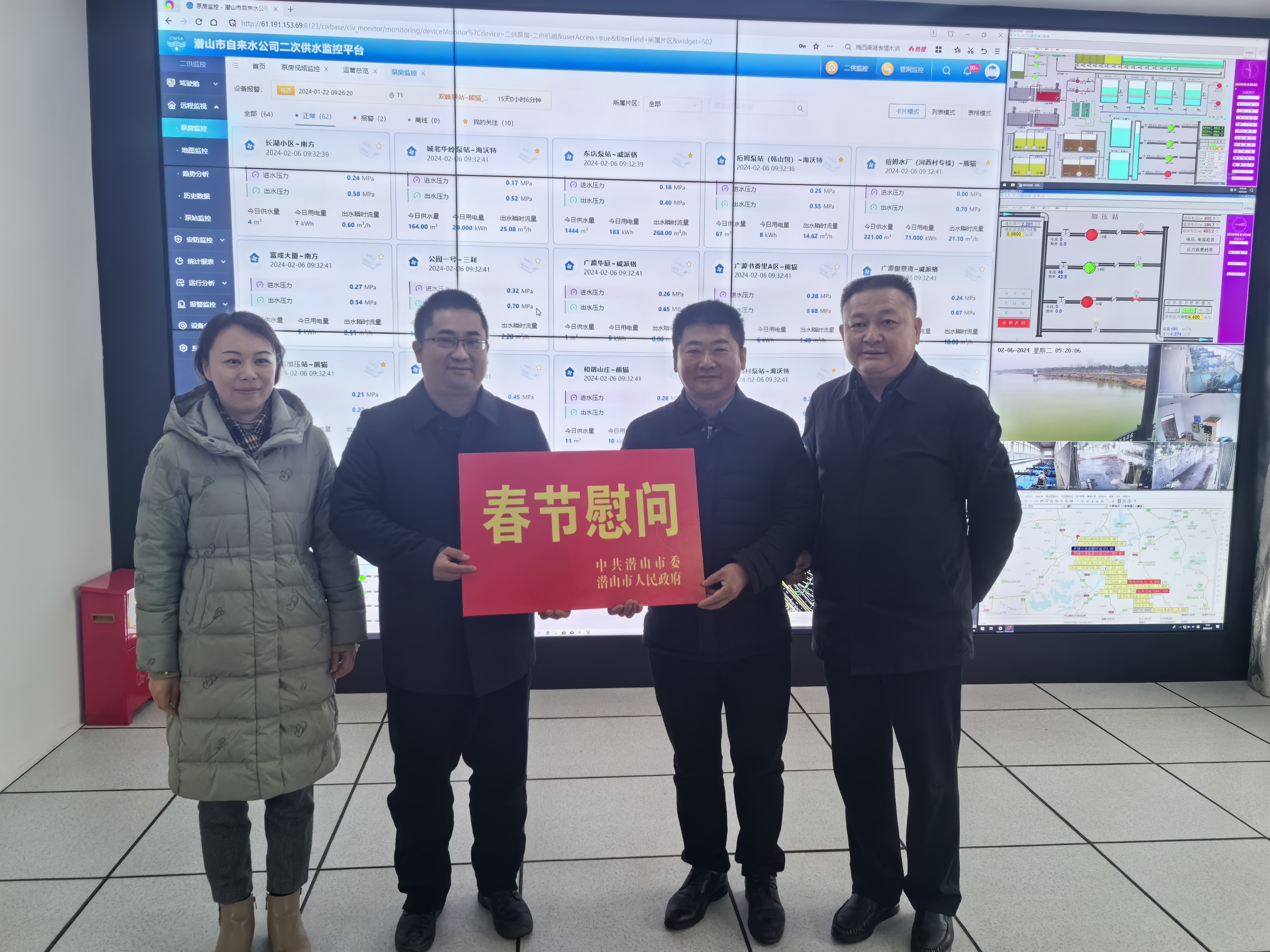 2024年2月6日(農(nóng)歷臘月二十七),市委常委、常務(wù)副市長(zhǎng)徐鄭生,市委常委、宣傳部長(zhǎng)華小芬?guī)ш?duì)來司開展春節(jié)慰問。在公司大院內(nèi),徐鄭生詳細(xì)了解公司生產(chǎn)經(jīng)營狀況、發(fā)展計(jì)劃和需求;在公司調(diào)度中心,他現(xiàn)場(chǎng)觀摩了智慧水務(wù)平臺(tái)操作運(yùn)轉(zhuǎn)情況,并送上慰問金。