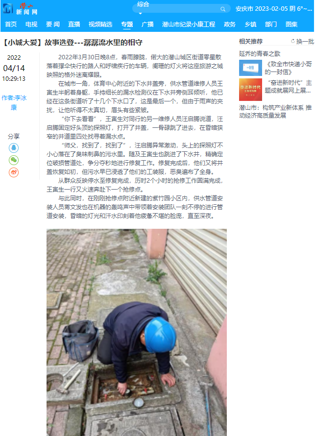 “你下去看看”,王寅生對同行的另一維修人員汪啟騰說道,汪啟騰固定好頭頂?shù)奶秸諢?,打開了井蓋,一骨碌跳了進(jìn)去,在昏暗狹窄的井道里四處找尋著漏水點。