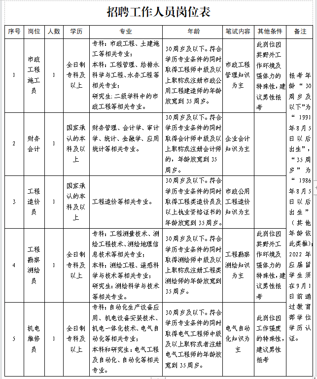 招聘崗位和人數(shù):市政工程施工員1人,工程造價(jià)員1人,財(cái)務(wù)會(huì)計(jì)1人,機(jī)電維修員1人,工程勘察測(cè)繪員1人。