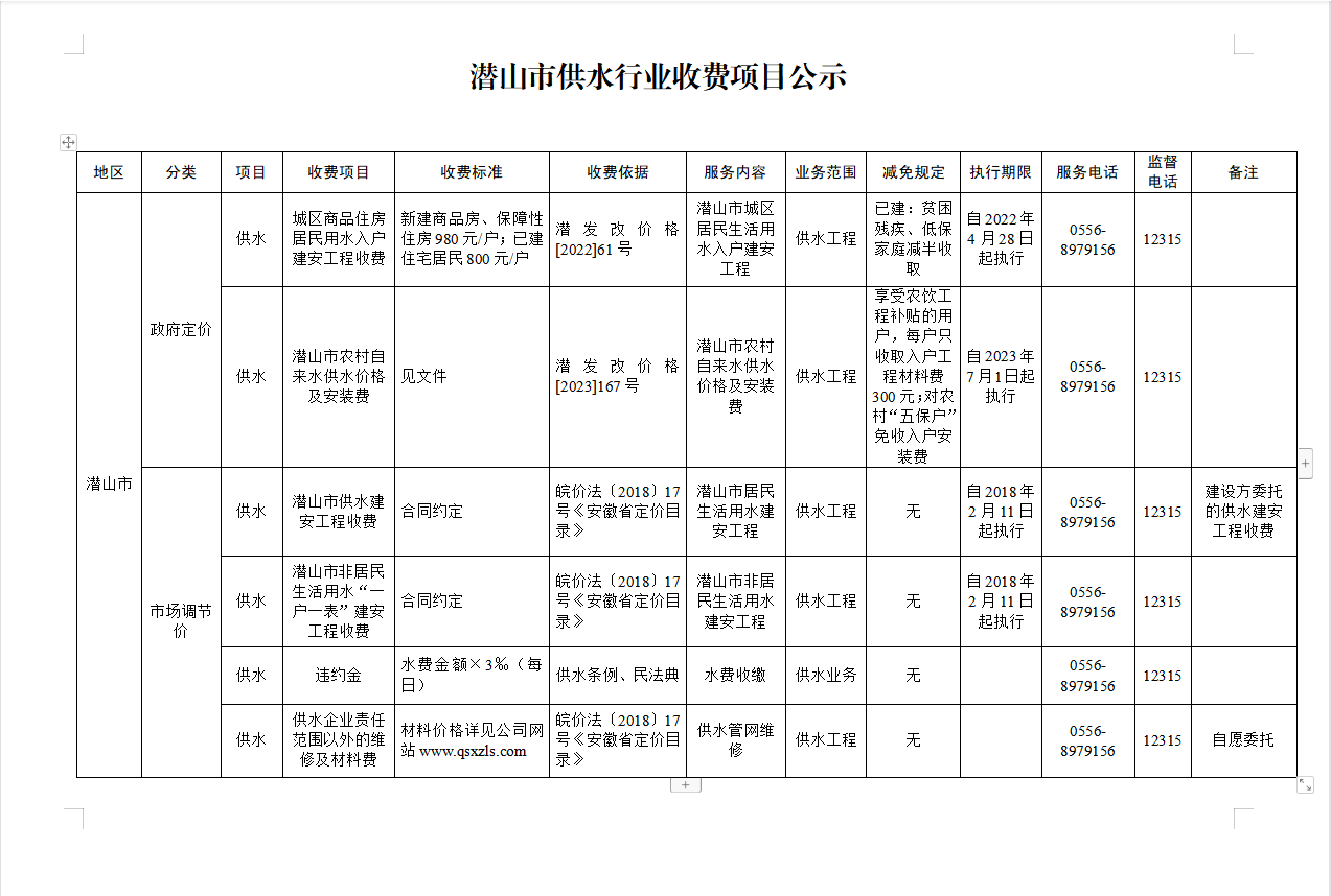 潛山市供水行業(yè)收費項目公示