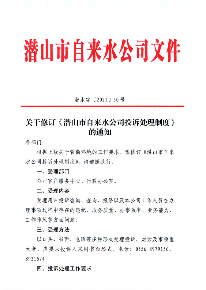 關于修訂《潛山市自來水公司投訴處理制度》的